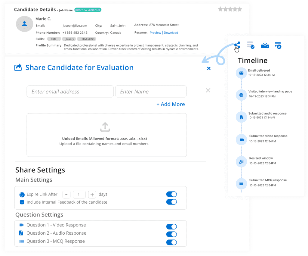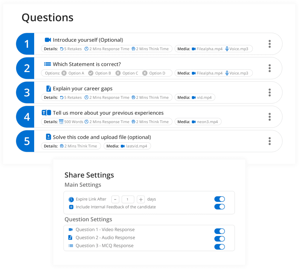 VidHirePro makes it possible for you to conduct various audio assessments, including interview simulations, presentation tasks, and conversational evaluations, designed to gauge communication skills, confidence, and personality traits, providing a well-rounded view of each candidate.